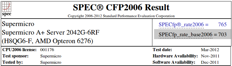 Sul sito web www.spec.org sono disponibili i dati ottenuti con il benchmark CPU2006 su alcuni server a 64 core. In figura è indicato l'indice CFP2006 ottenuto per un server Supermicro con 4 CPU Opteron 6276 a 2,3 Ghz (sino a 3,2 Ghz in Turbo Core) e 256 GB di RAM PC3-12800.