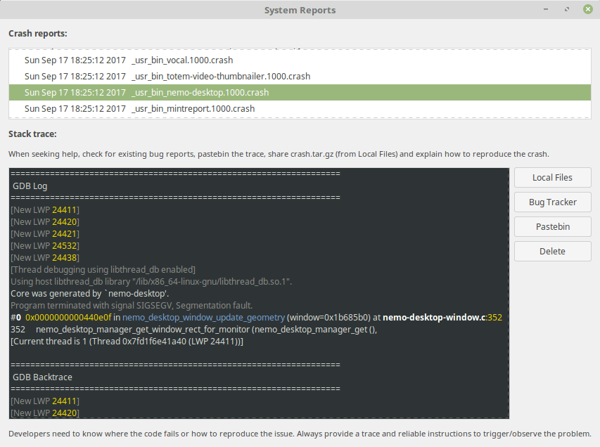 Questo programma si chiamerà mintReport e si occuperà della raccolta dei crash di sistema. Utilizzando apport come backend, il tool verrà eseguito ogni qual volta un’applicazione si blocca. mintReport si occuperà di elencare questi reports e generare gli stack
