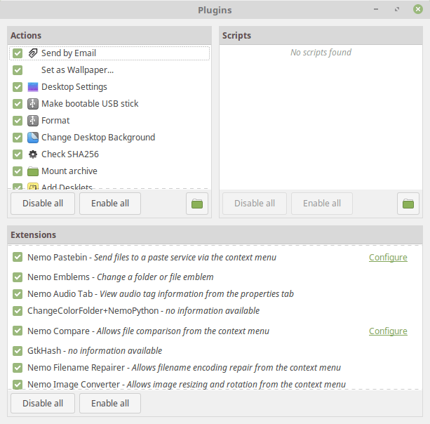 Le estensioni di Nemo (il file manager) sono ora in grado di dialogare con il programma e di fornire il nome del loro strumento di configurazione abilitando così il pulsante “Configura” nella finestra di dialogo dei plugin di Nemo
