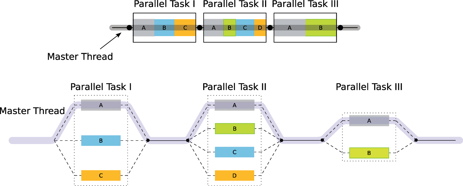 Solitamente un programma consiste di parti che vanno eseguite in modo sequenziale, all'interno di un unico thread, e di parti che invece possono essere eseguite più velocemente impiegando più thread, come ad esempio alcuni lunghi cicli for. Quando si scrive un'applicazione con OpenMP, per default il codice viene eseguito da un unico thread chiamato master thread. Quando si arriva a un punto in cui l'esecuzione può essere presa in carico da un numero maggiore di thread, si possono usare le direttive di compilazione di OpenMP per delimitare queste porzioni di codice. In definitiva, quindi, in un programma OpenMP alcune parti di codice restano seriali, e altre vengono parallelizzate.